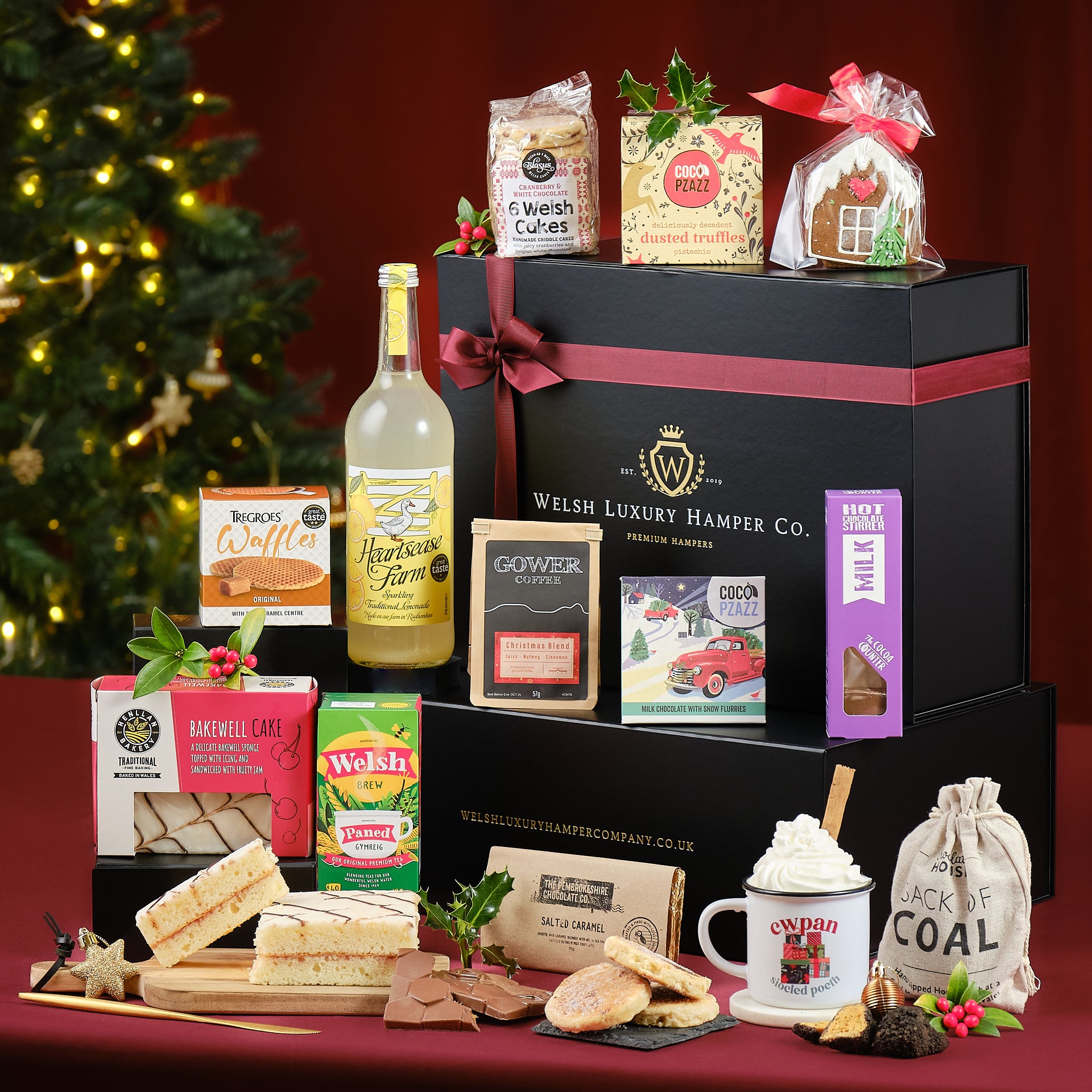 Sweeten the festive season with the Christmas Treats Hamper – a luxurious collection of artisan chocolates, buttery Welsh bakes, playful festive treats, and cosy winter warmers. From sparkling drinks and indulgent truffles to warming Christmas blend coffee, every bite and sip is designed to bring joy, indulgence, and a little seasonal magic.